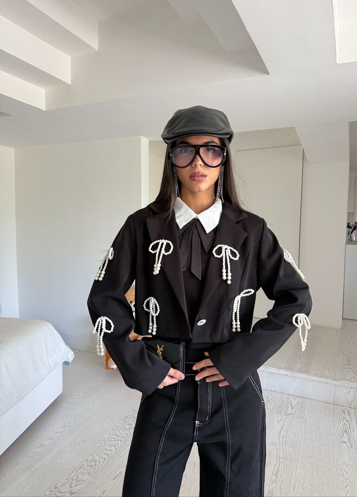 Giacca crop over size con spalline e fiocchi di perle su tutta la giacca. Tg unica veste fino alla 44/46