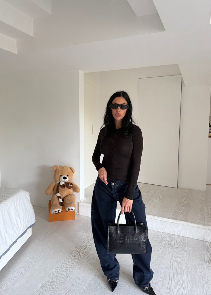 Jeans balloon tela rigida. La modella indossa m