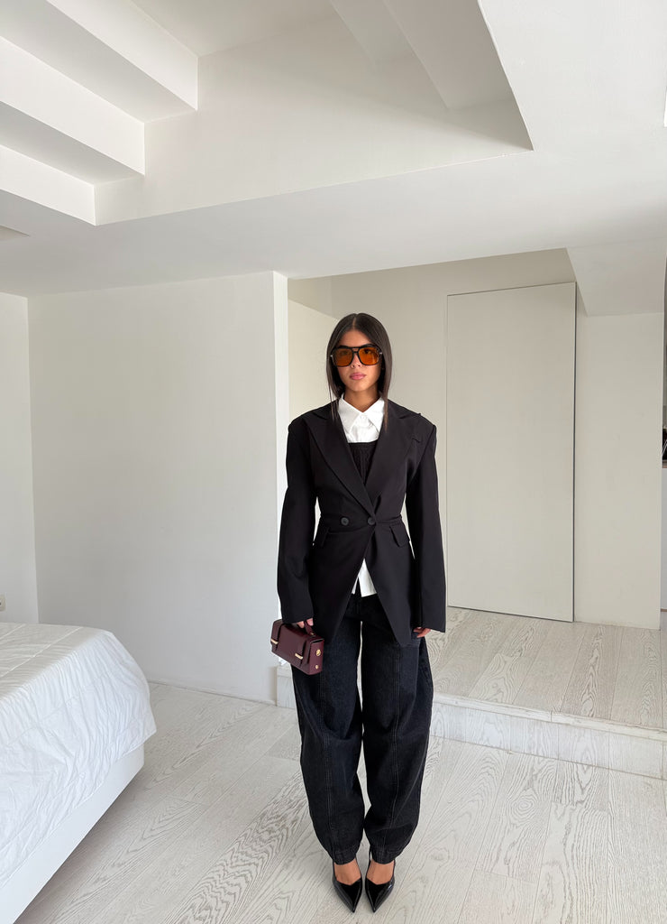 Jeans ballon tela rigida alto in vita . La modella indossa S
