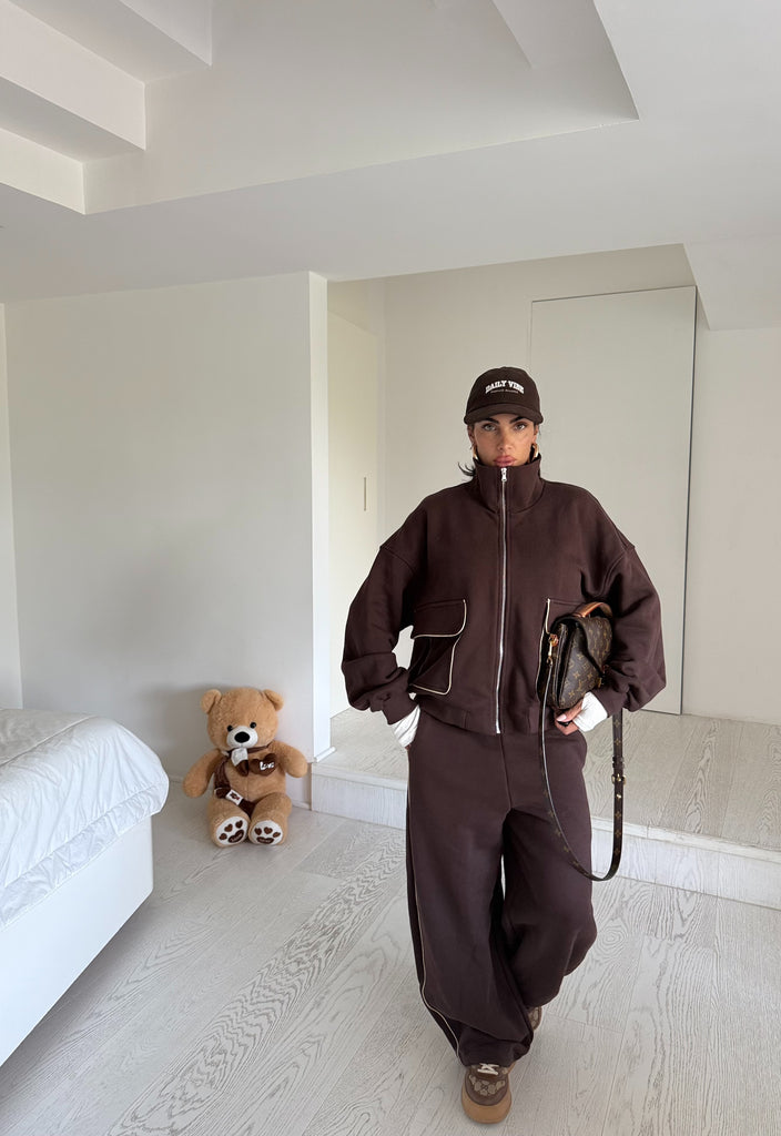 Coordinato in tuta composto da pantalone con molla in vita e cardigan felpato con taschoni e zip sul davanti. La modella indossa Sm