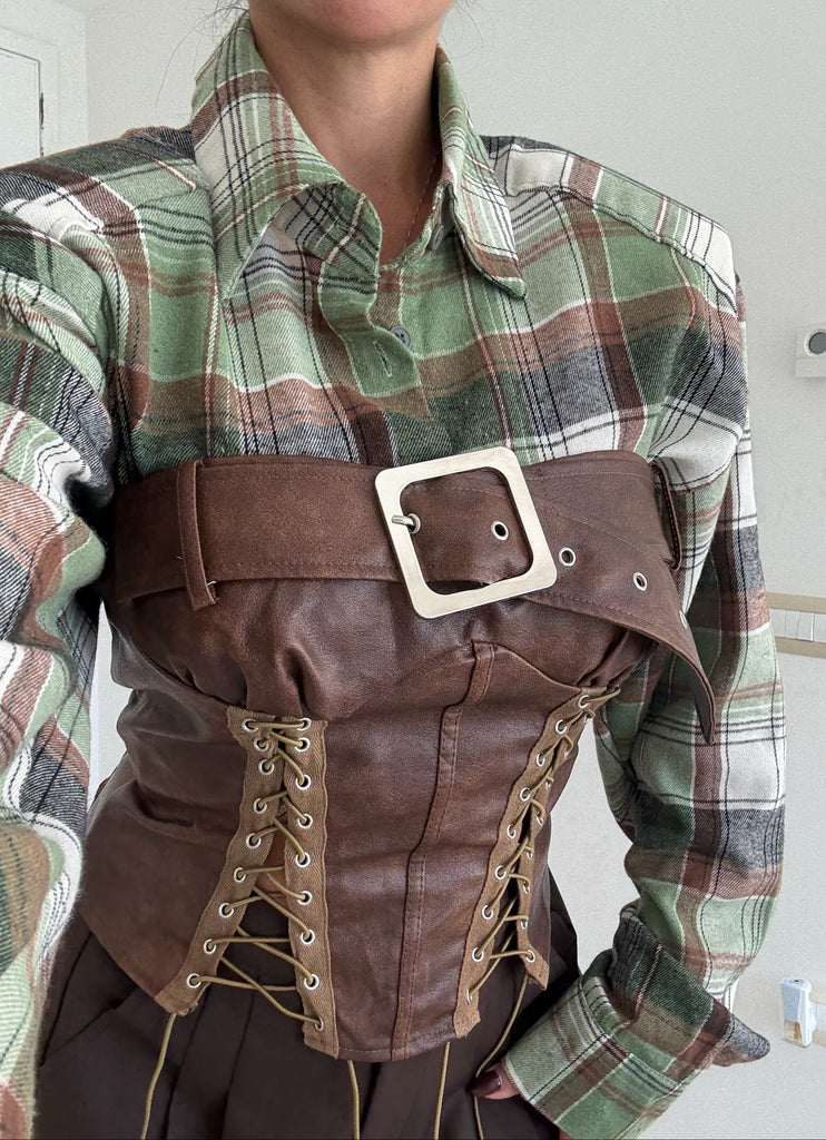 Corpetto in ecopelle con stringhe sul davanti regolabili e cintura sul davanti. Tg unica