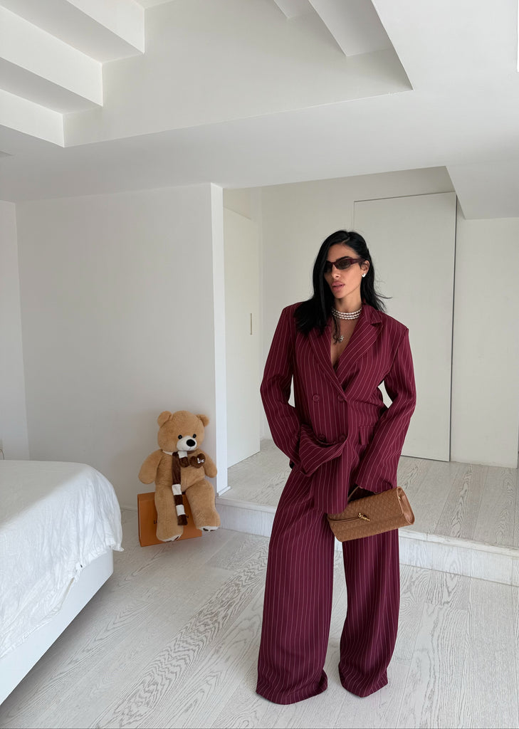 Tailleur 3 pezzi composto da : pantalone palazzo elasticizzato tg unica. Gilet con 3 bottoncini tg unica. Giacca doppiopetto over size con spalline tg unica