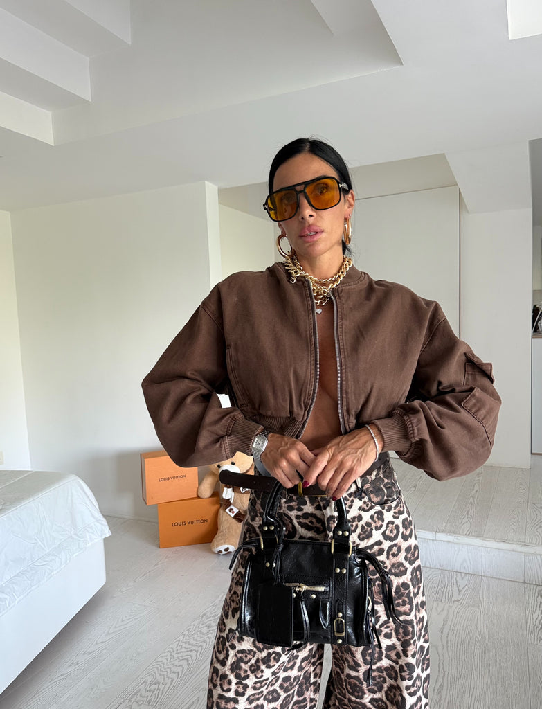 Bomberino corto in tessuto con molla in vita e zip sul davanti . La modella indossa S