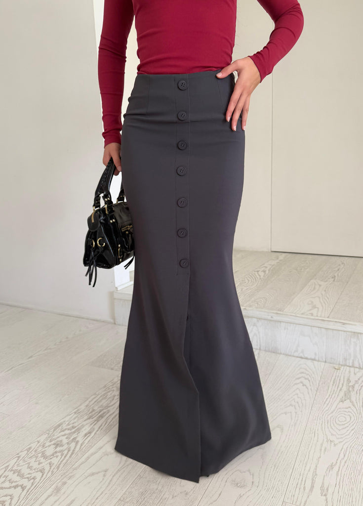 Gonna luna elasticizzata leggermente a campana con bottoni sul davanti. La modella indossa S