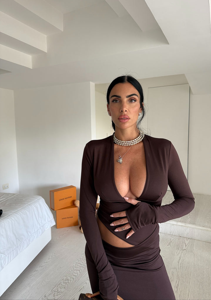 Abito lungo con scollo a V elasticizzato in lycra. Tg unica