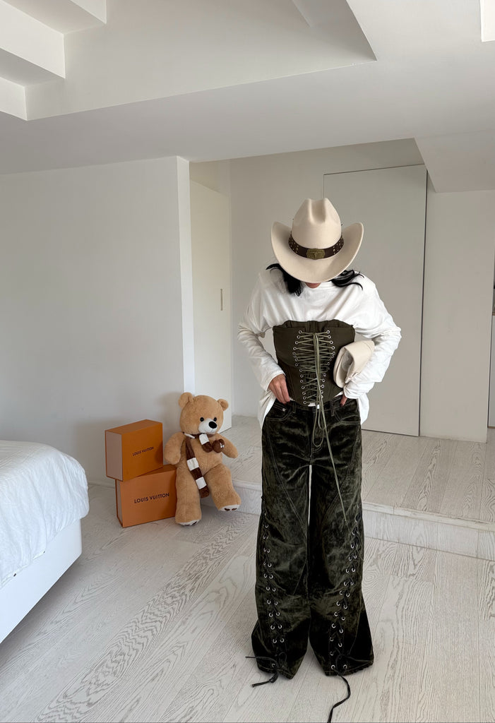 Pantalone in vellutino con stringhe sul davanti asimmetriche. La modella indossa S